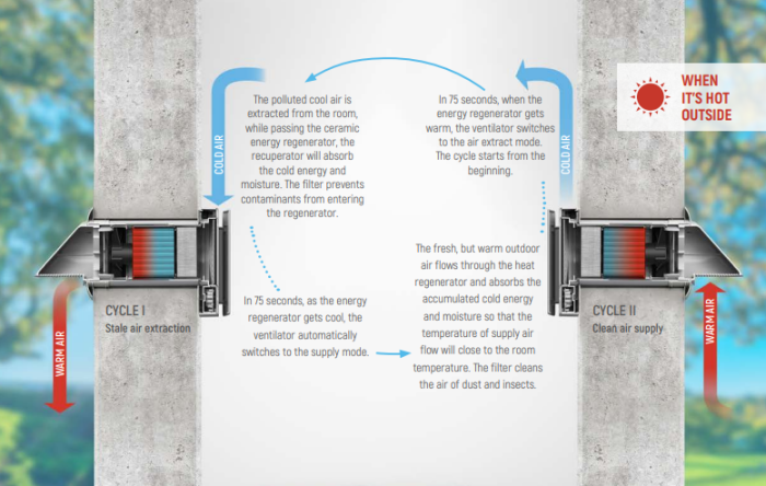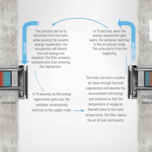 The ventilator runs in two cycle of 75 seconds each, to provide heat and moisture regeneration.